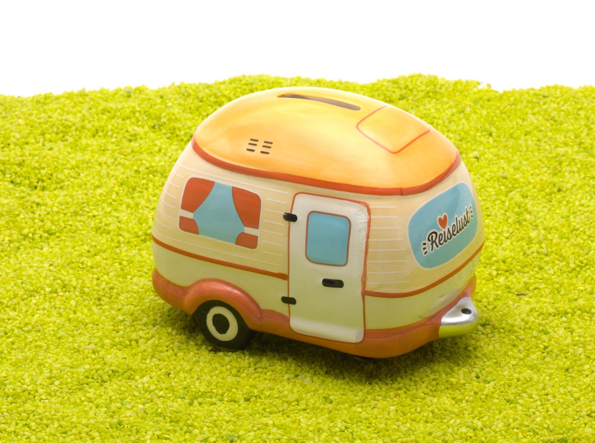 Figürliche Spardose in Campingbus-Form aus Dolomite in Orange und Weiß